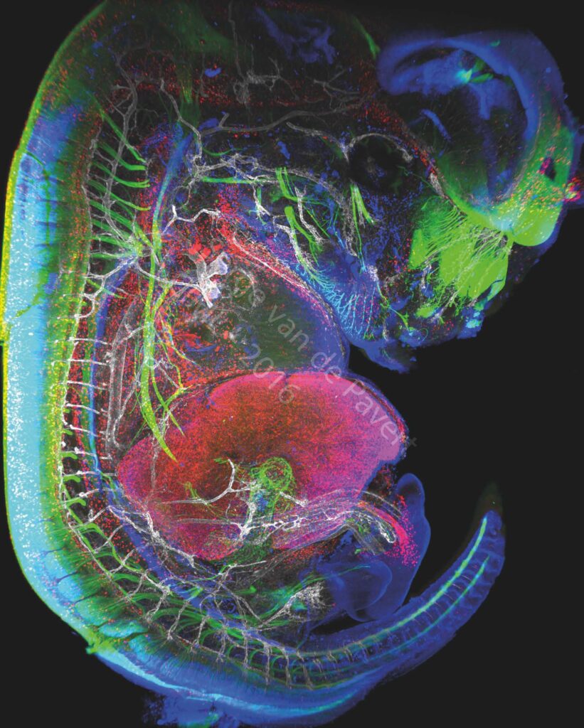 “Immunofluorescent staining of a complete mouse E13.5 embryo reveals neurons (labeled with BetaIII Tubulin), macrophages and lymphatic endothelial cells in red (labeled with Lyve-1), the nuclei of specific neurons and lymphatic endothelial cells are marked in blue (Prox1 labeling) and the vascular network in white (Pecam-1 labeling). The eye of the embryo and the nasal neurons can be seen in green. On the left, the spinal cord is marked in green. The vertebrae are visible through the marking of the dorsal root ganglia in green, and blood vessels marked in white. The heart is visible just above the liver which is labeled with LYVE-1 antibody. The embryonic intestine, not far from the liver, is visualized by the innervation of neurons in green. The umbilical cord can be observed by neighboring white blood vessels and macrophages in red. This picture was generated in the study on the formation of lymph nodes and lymphatic system. Their formation, initiated in the embryonic stage, can be modified by changing certain dietary factors affecting cell differentiation. These visualizations are therefore intended to analyze the movements of cells involved in the formation of the lymphatic system.” Image Serge van de Pavert/CIML.